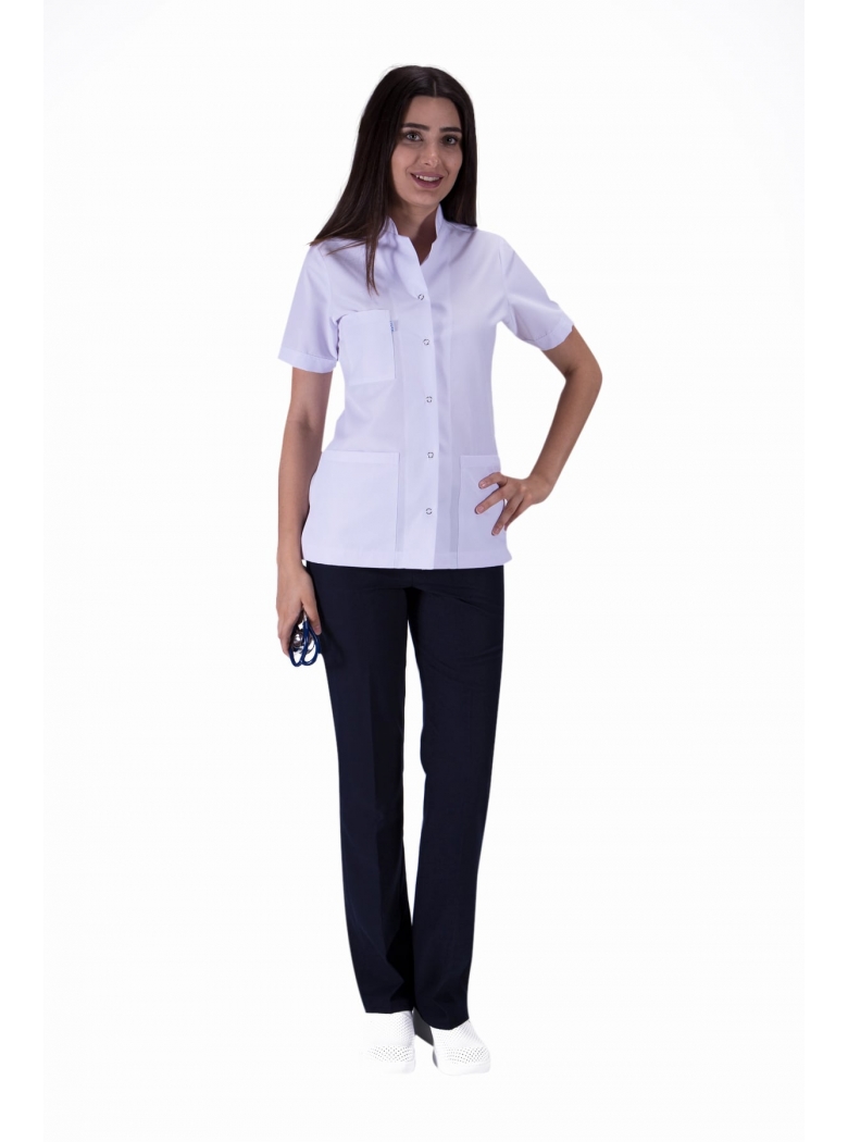 BAYANLAR İÇİN, HAKİM YAKALI, KISA BOY VE KISA KOLLU, ARKADAN PENSLİ VE ÜÇGEN SABİT KUŞAKLI, DOKTOR, LABORANT ÖNLÜĞÜDÜR.