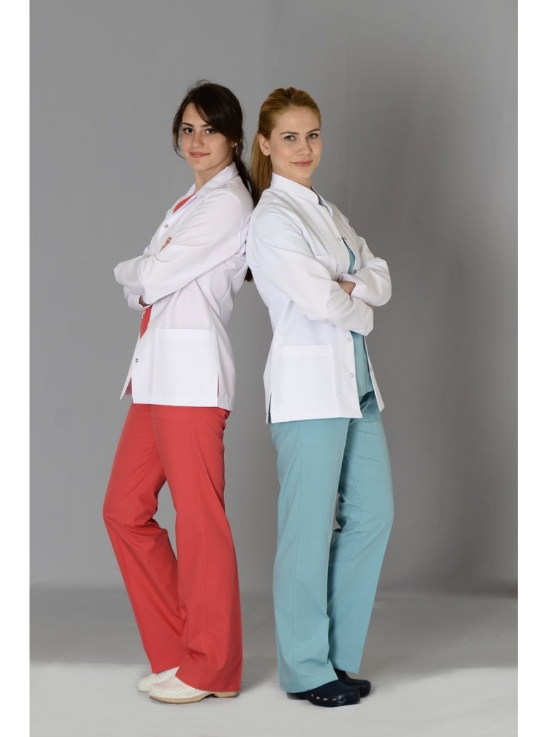 BAYANLAR İÇİN, HAKİM YAKALI, KISA BOY VE UZUN KOLLU, ARKADAN PENSLİ VE ÜÇGEN SABİT KUŞAKLI, DOKTOR, LABORANT ÖNLÜĞÜDÜR.