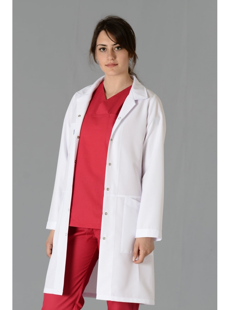 BAYANLAR İÇİN, FİT KESİM, KLASİK YAKALI, 85 CM. BOYUNDA, ÇITÇITLI, ARKADAN PENSLİ VE SABİT ÜÇGEN KUŞAKLI, DOKTOR, ÖĞRETMEN, LABORANT ÖNLÜĞÜDÜR.
