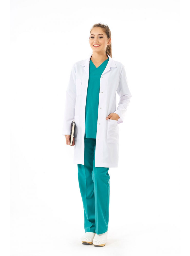 BAYANLAR İÇİN, KLASİK YAKALI, 85 CM. BOYUNDA, ARKADAN PENSLİ VE SABİT ÜÇGEN KUŞAKLI, DOKTOR, ÖĞRETMEN, LABORANT ÖNLÜĞÜDÜR.