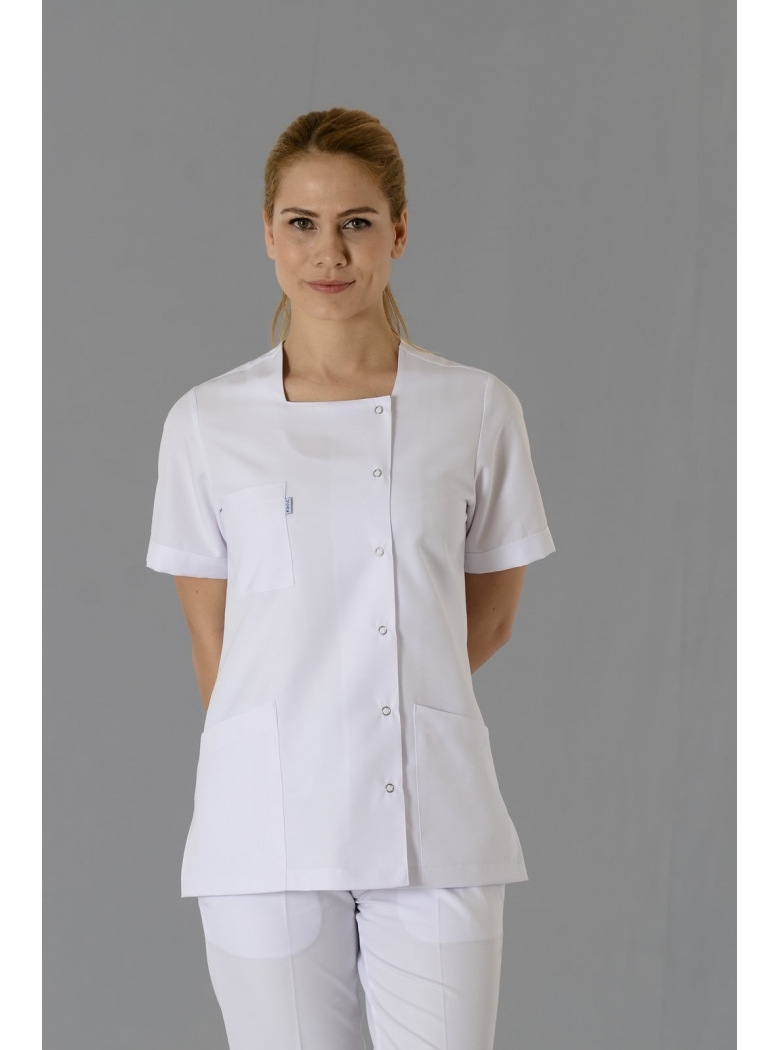 BEYAZ RENKLİ, KARE YAKA, ARKADAN PENSLİ, KISA KOLLU, YANDAN ÇITÇITLI CEKETTİR.