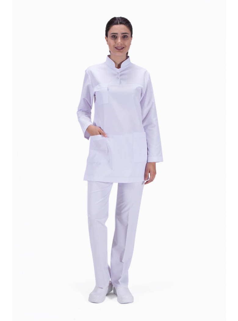 ÜST FORMA, BEYAZ RENKLİ, HAKİM YAKA, İKİ ÇITÇITLI, ARKADAN PENSLİ, UZUN KOLLU TUNİKTİR.
